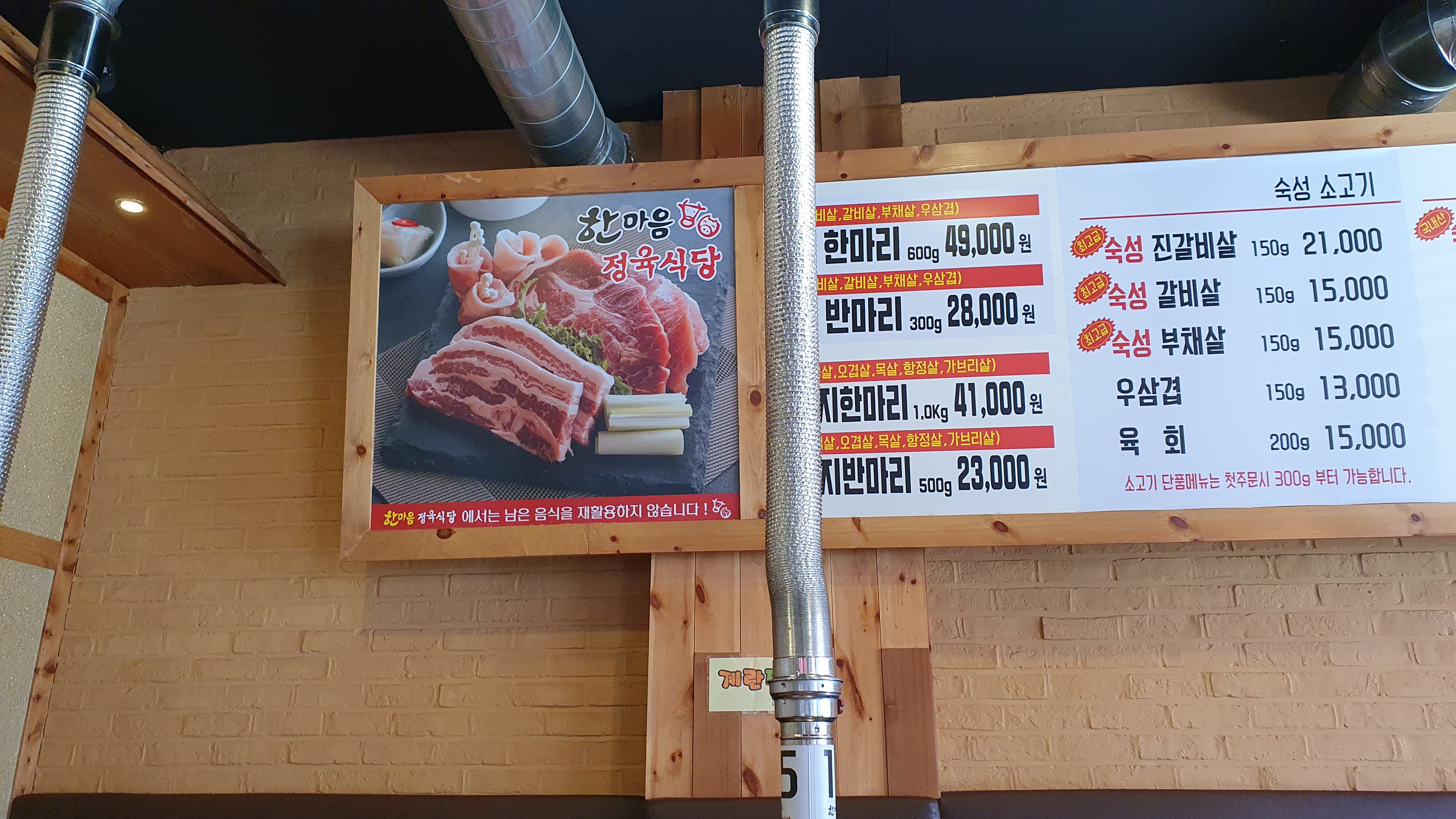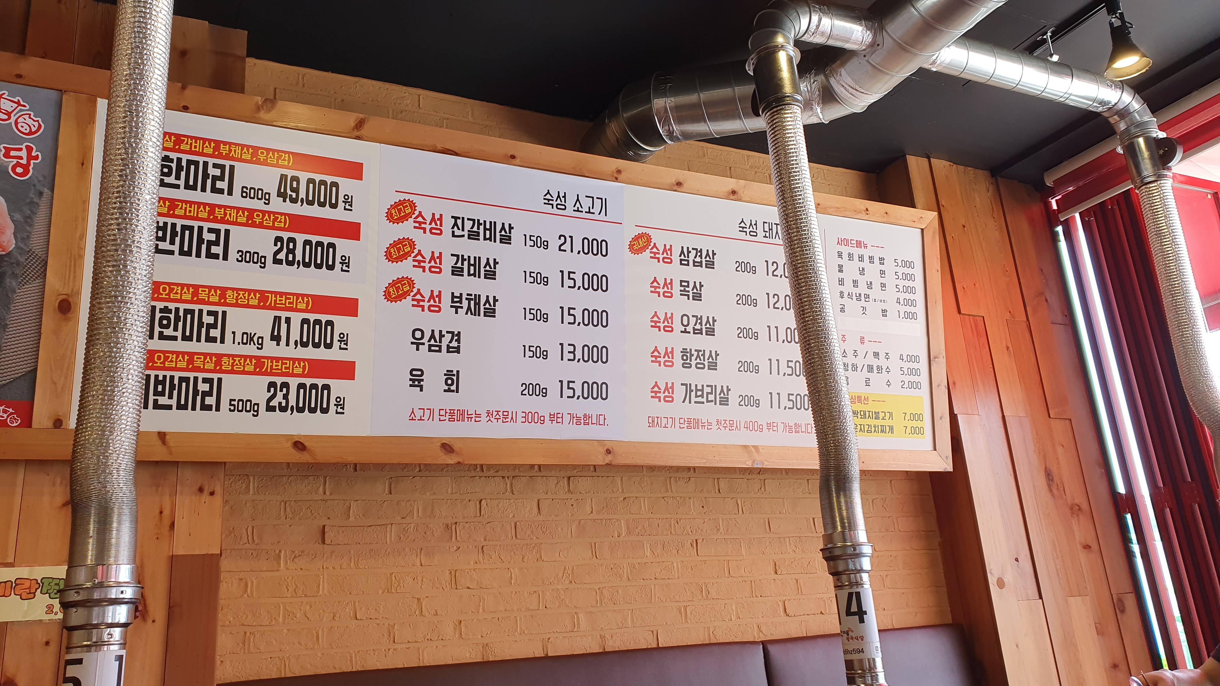 메뉴는 소랑 돼지고기가 있는데 한마리, 반마리 식으로 나와요 ㅎ 그리고 숙성고기는 세트가 아닌 따로따로 시키게 되어있구요. 남편은 고기를 좋아해서 저는 그냥 돼지 반마리면 되겠다고 했는데 더 먹고 싶다면서 소고기 반마리를 더 시키더라구요 ㅎ 사실 소고기 반마리는 진짜 양이 많진 않더라구요 ㅎ 소고기만 먹고 싶다면 그냥 소한마리를 시키면 되겠더라구요 ㅎ