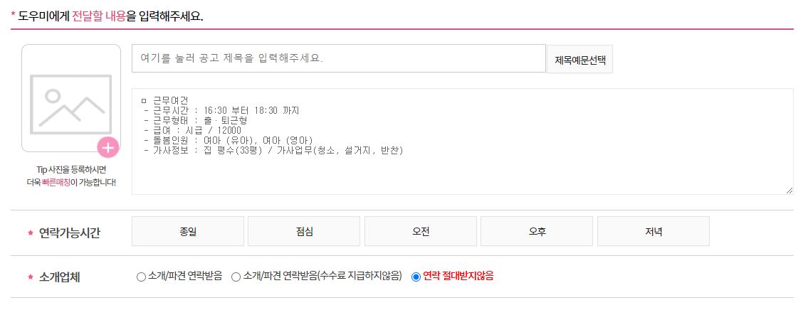 제목을 입력하신 뒤 사진이 있으시면 사진도 등록해 주세요. 내용을 좀 더 자세하게 쓸 수 있는데요, 원하는 것이 확실하시다면 더 자세하게 쓰시는 것이 나중에 시터나 도우미를 구할 때 서로 간의 소통이나 피로를 더시는데 도움이 될 것 같아요. 여러 명에게 계속 같은 것을 설명하려면 피로도는 올라가겠죠. 또한 소개업체 연락받는 것으로 설정해 놓으시면 다른 업체에서 계속 연락이 올 수 있어 원하지 않으신다면 연락받지 않음으로 설정해주세요.