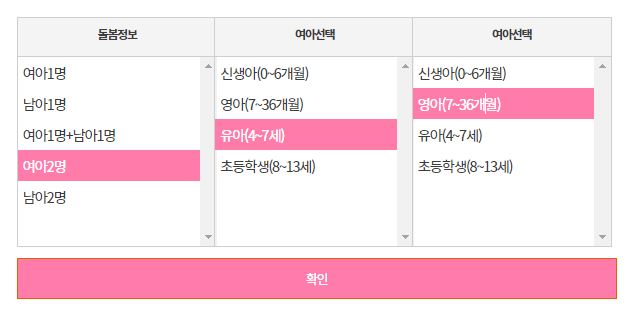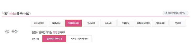 베이비시터부터 육아나 가사, 등 하원 도우미 등 원하는 서비스가 나열되어 있는데요, 저 같은 경우는 아이들이 많이 컸기도 하고 어린이집부터 초등학생까지 다양한 연령대이기 때문에 등 하원 도우미가 맞았어요. 집에서 아이들을 케어하시는 분이시라면 육아+가사가 맞을 수 있겠네요. 집에 와서 아이들의 공부를 원하신다면 학습시터를 선택하셔도 좋을 것 같아요. 돌봄 인원을 선택하면 밑에 이미지가 나오는데요, 3명일 경우의 선택지는 없더라고요. 2명 이상은 같은 걸로 하는 것인지는 모르겠지만 나중에 공지사항에 3명이라고 입력해 놓으면 좋을 것 같아요.