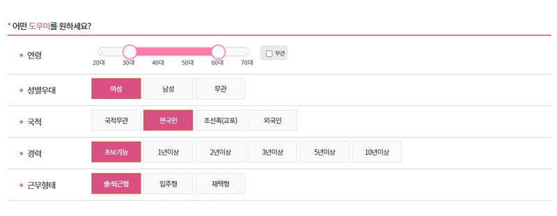 연령대와 성별, 국적, 경력, 근무형태 등을 선택할 수가 있어요. 국적 무관이나 조선족 취업을 원하신다면 인증된 도우미를 채용하기 위해서 비자 등을 확인하시는 것도 도움이 될 수 있을 것 같아요.