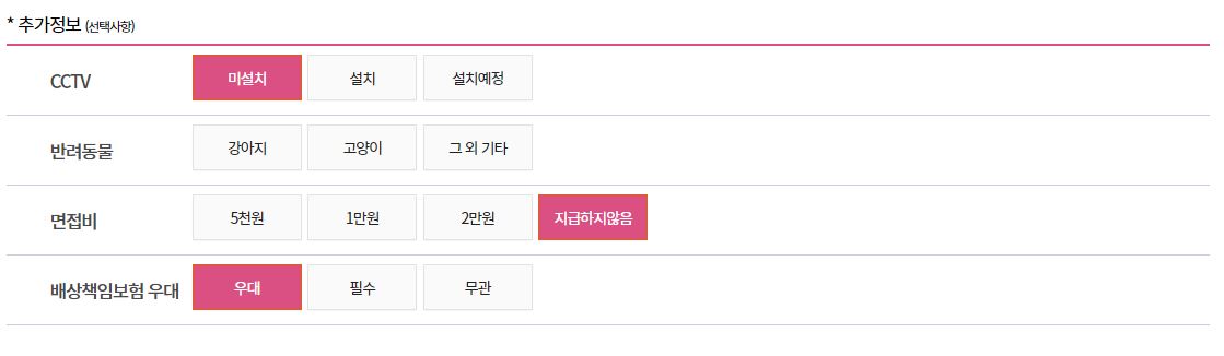 이것은 선택사항이기 때문에 설정을 하지 않으셔도 그냥 넘어가는데요, 반려동물이 없을 경우 선택하지 않으셔도 넘어가고 면접 비용도 설정하실 수 있습니다. 다른 특별한 것이 없다면 그냥 지나가셔도 됩니다.