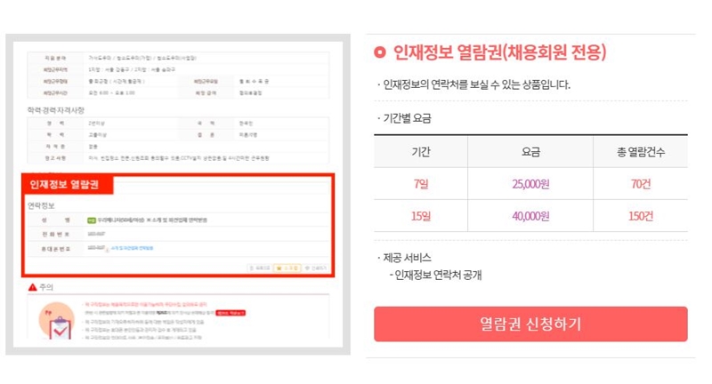 직접 지역 선택을 하셔서 인재정보를 찾아보실 수 있는데 열람권 신청을 하셔야 해요. 저렴하다고 생각하지 않으실 수도 있지만 당장 급하시거나 더 많은 정보를 보고 싶으신 분은 이용해 주시면 될 것 같아요.