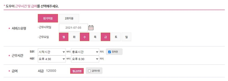 1회를 이용해보시고 마음에 드신다면 정기이용을 해도 되고 처음부터 정기적으로 이용하셔도 되는데요, 근무 시작일과 요일, 시간 등을 선택해 주시면 됩니다. 근무시간 옆에 등 하원이라고 체크하게 돼있는데요, 이에 해당할 경우 등 하원을 누르시고 등원이나 하원 시간을 설정해주시면 됩니다. 또 시급도 조정할 수 있어요. 급여 수정을 누른 뒤에 시급을 수정하시고 월급을 원하시면 월급 변환을 누르시고 바꿔주시면 됩니다.
