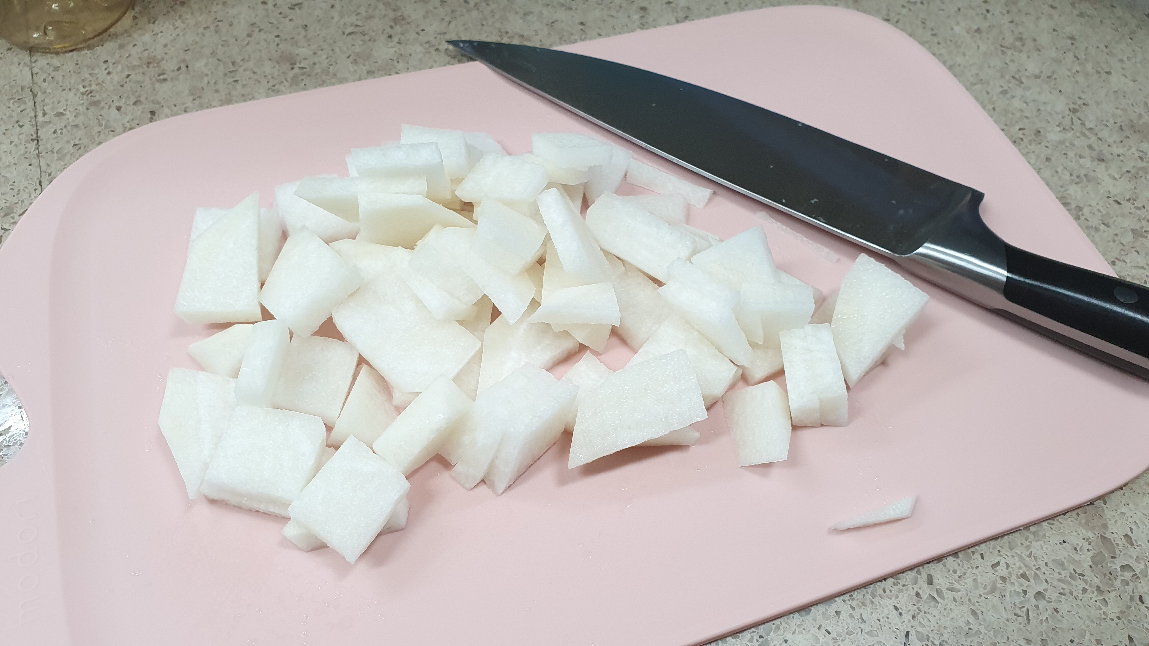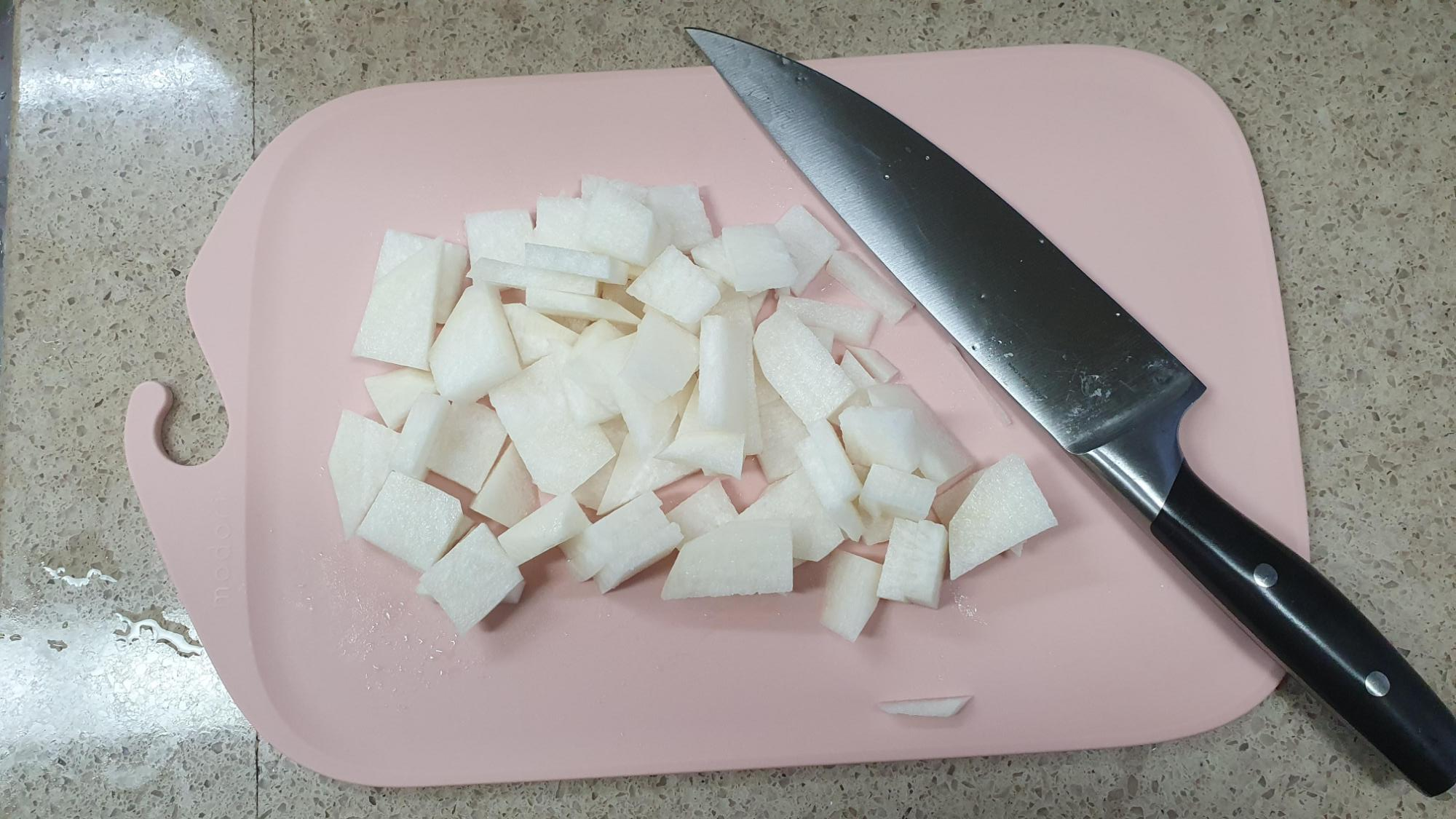 또 용도에 맞게 야채, 생선, 고기, 김치 등 정해놓고 따로 쓸 수 있으니까 더욱 좋구요. 물기있는걸 썰어도 살짝 깊이가 있는 디자인이라 물이 흘러내리지 않아요 ㅎ 그리고 실리콘 재질로 되어있어서 무를 썰고 냄비에 옮겨 담을 때 휘어지기 때문에 흘리지 않고 잘 넣을 수 있는 것도 편리했어요 ㅎ