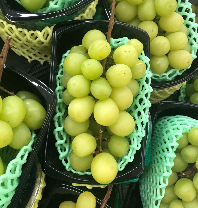 샤인 머스켓은 망고 포도라고도 불리는데요, 일본에서 만들어진 품종으로 씨가 없고 맛있는 포도를 만들기 위해 인력이 많이 들어가서 가격이 떨어지지 않는 것이라고 합니다. 샤인 머스켓은 100g 당 50-60kcal로 포만감도 있고 맛도 좋아 인기가 많습니다.