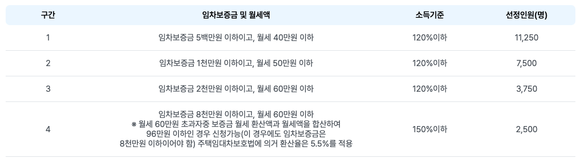 - 주거 형태: 보증금 8천만 원 이하 + 월세 60만 원 이하의 임차주택 거주