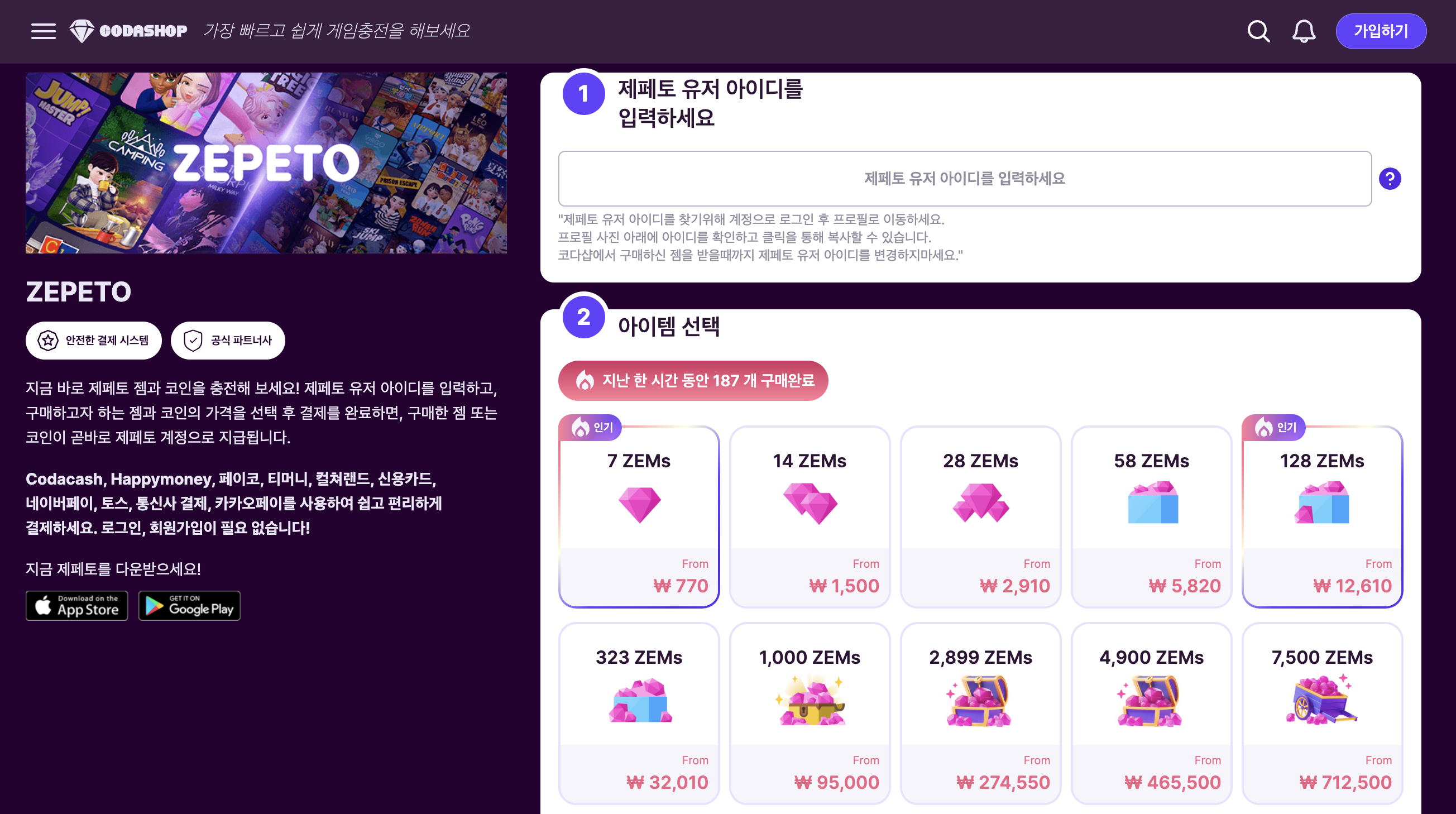 - 코다샵 접속: https://www.codashop.com/kr 에서 ZEPETO 선택