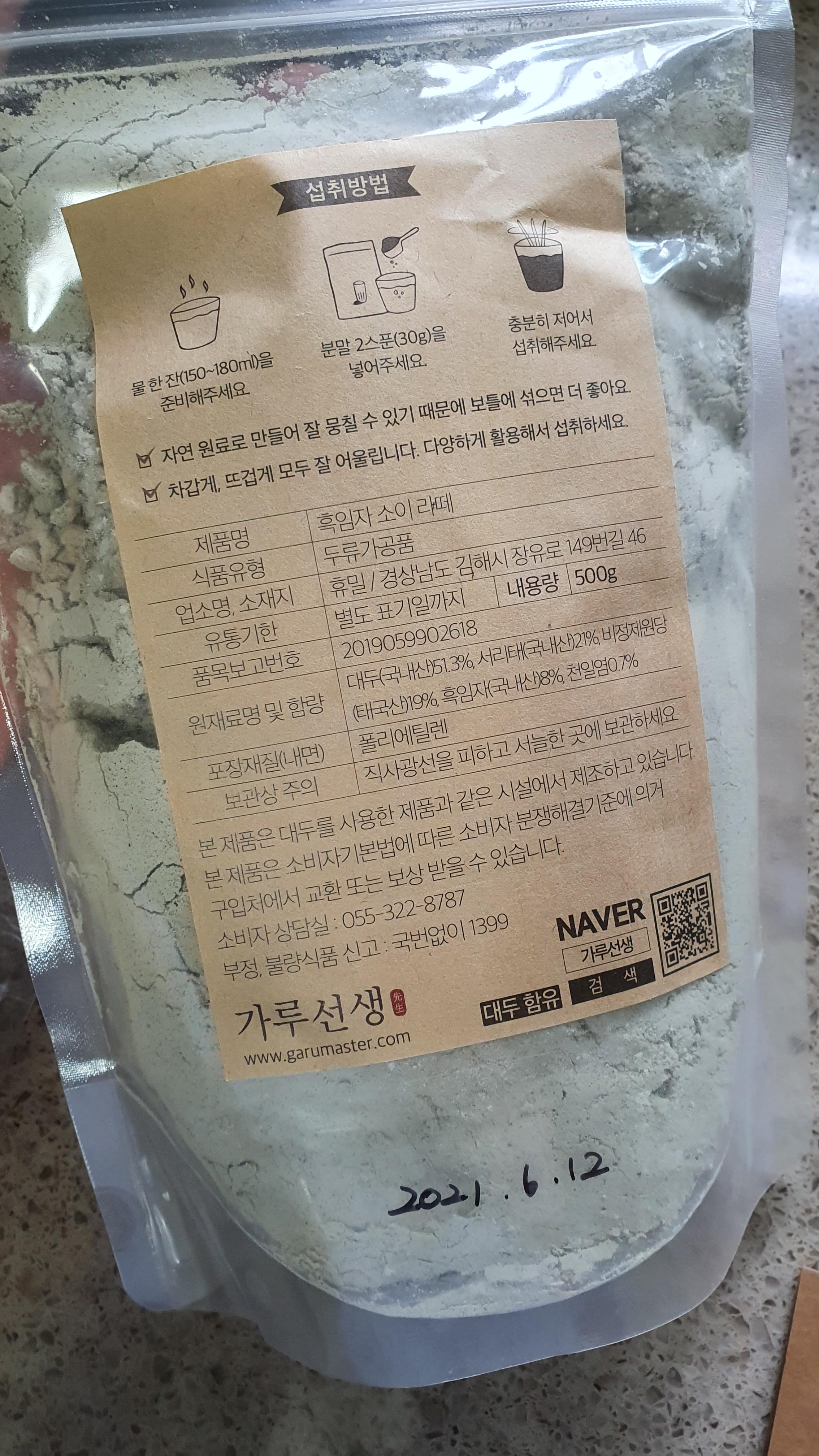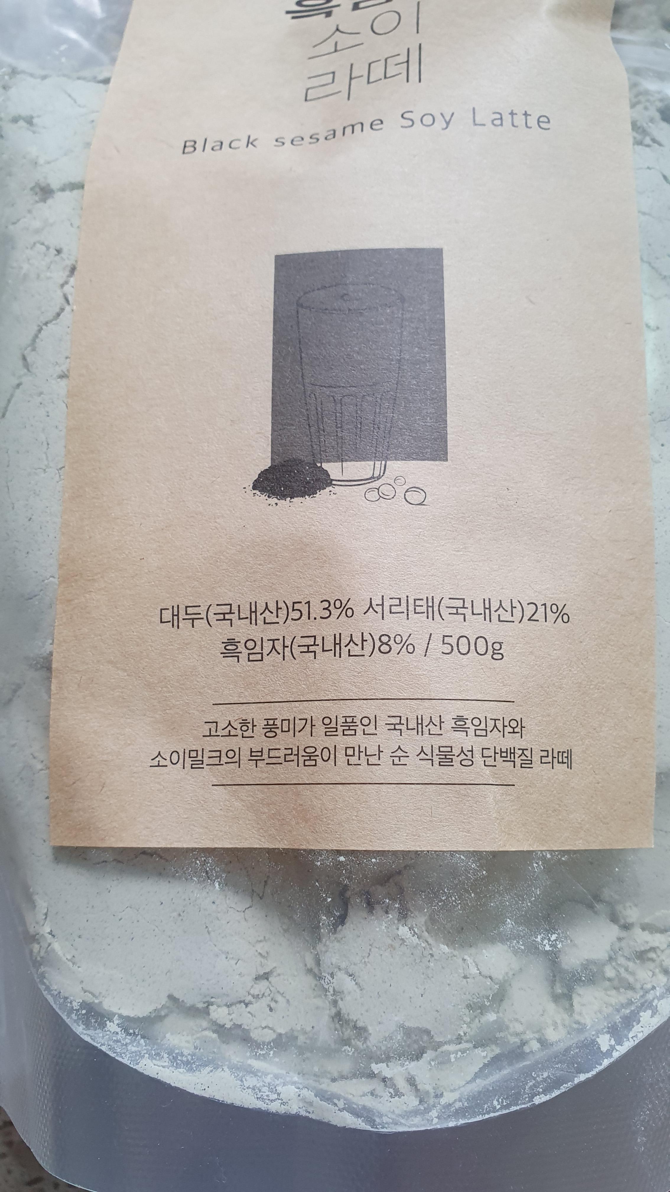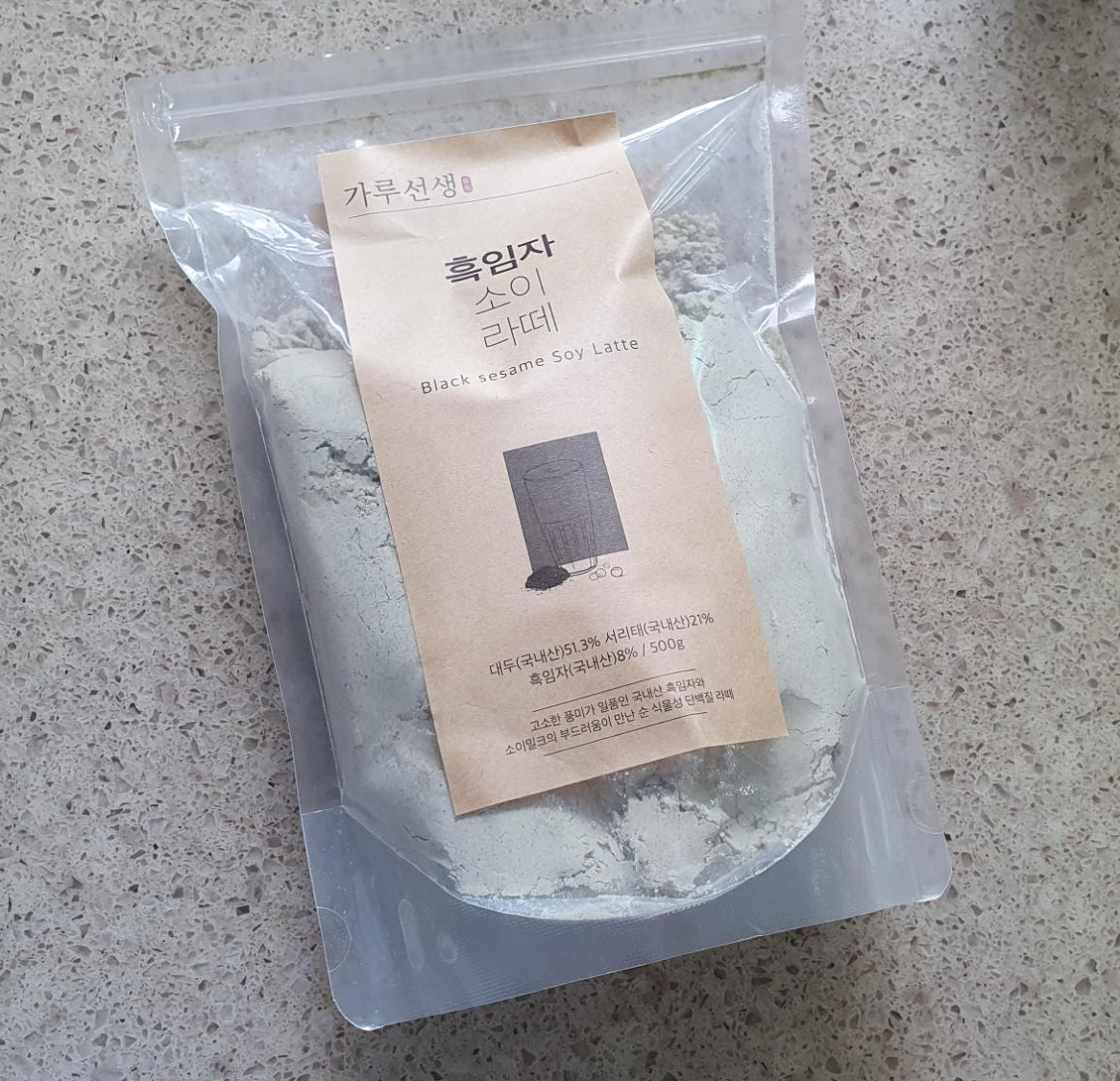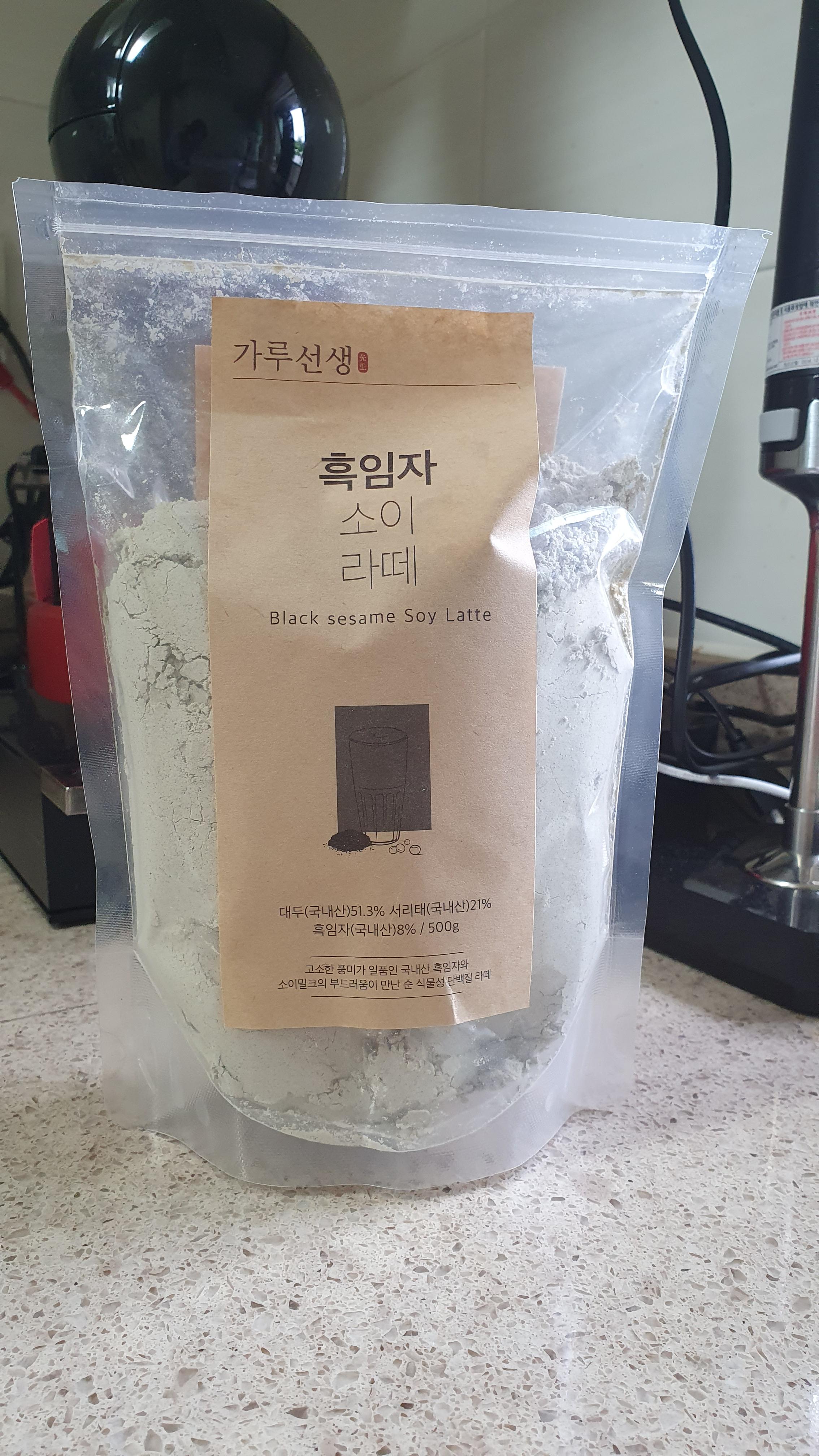 이게 흑임자 소이라떼 분말이에요 ㅎ 이게 대두와 서리태, 흑임자, 그리고 비정제원당, 천일염 이렇게가 끝이에요!